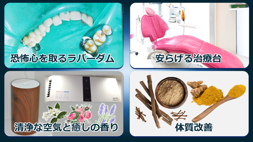 患者目線で配慮、ラバーダム、心地良いチェアーと清浄空間、アロマでリラックスした状態で治療を受けられます。